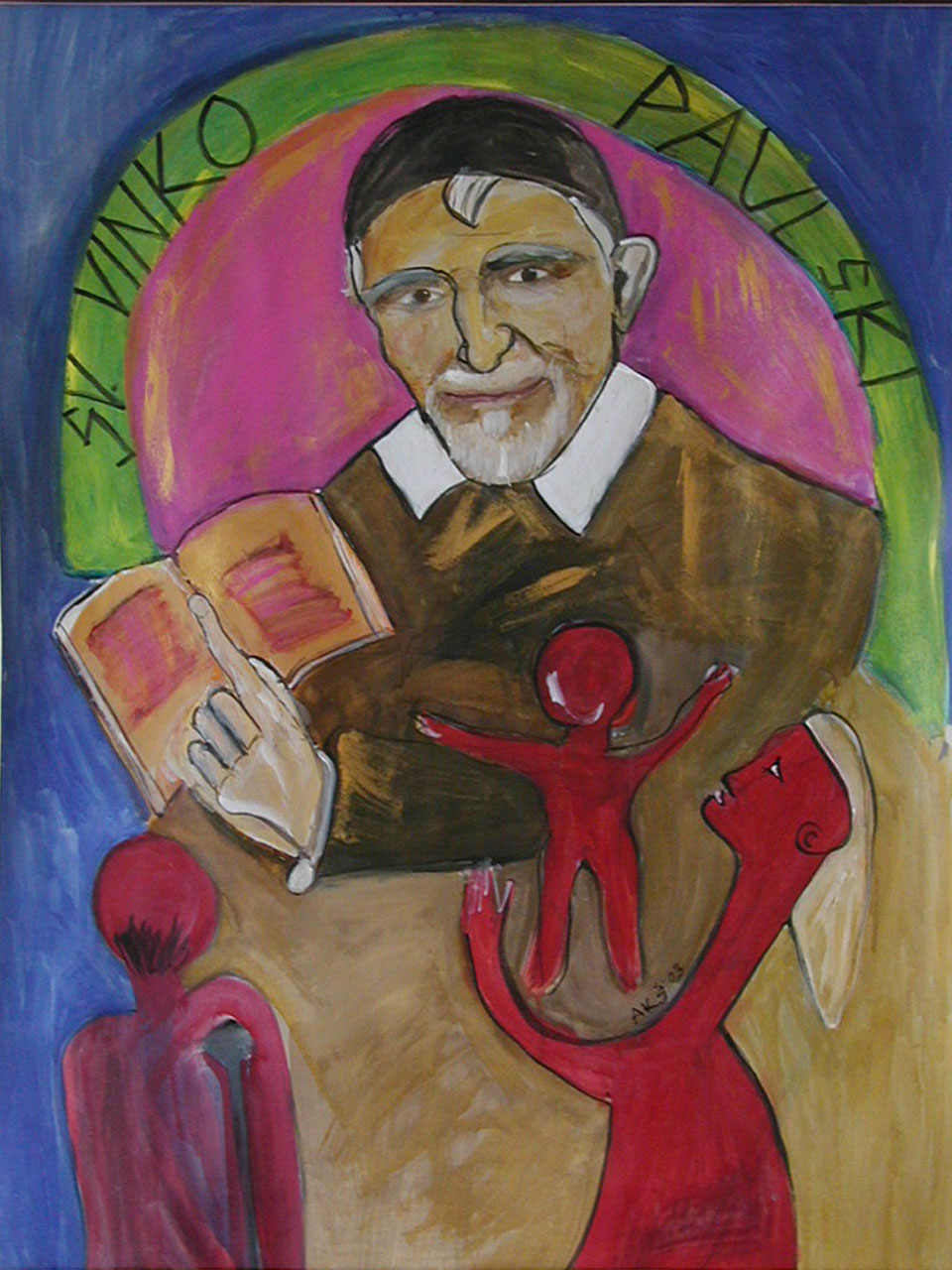 Painting/drawing, Vincent de Paul, cassock, skullcap, points to page in a book (Bible?); name above in Croatian; woman and child, and handicapped man below; original in Vincentian house, Zagreb
