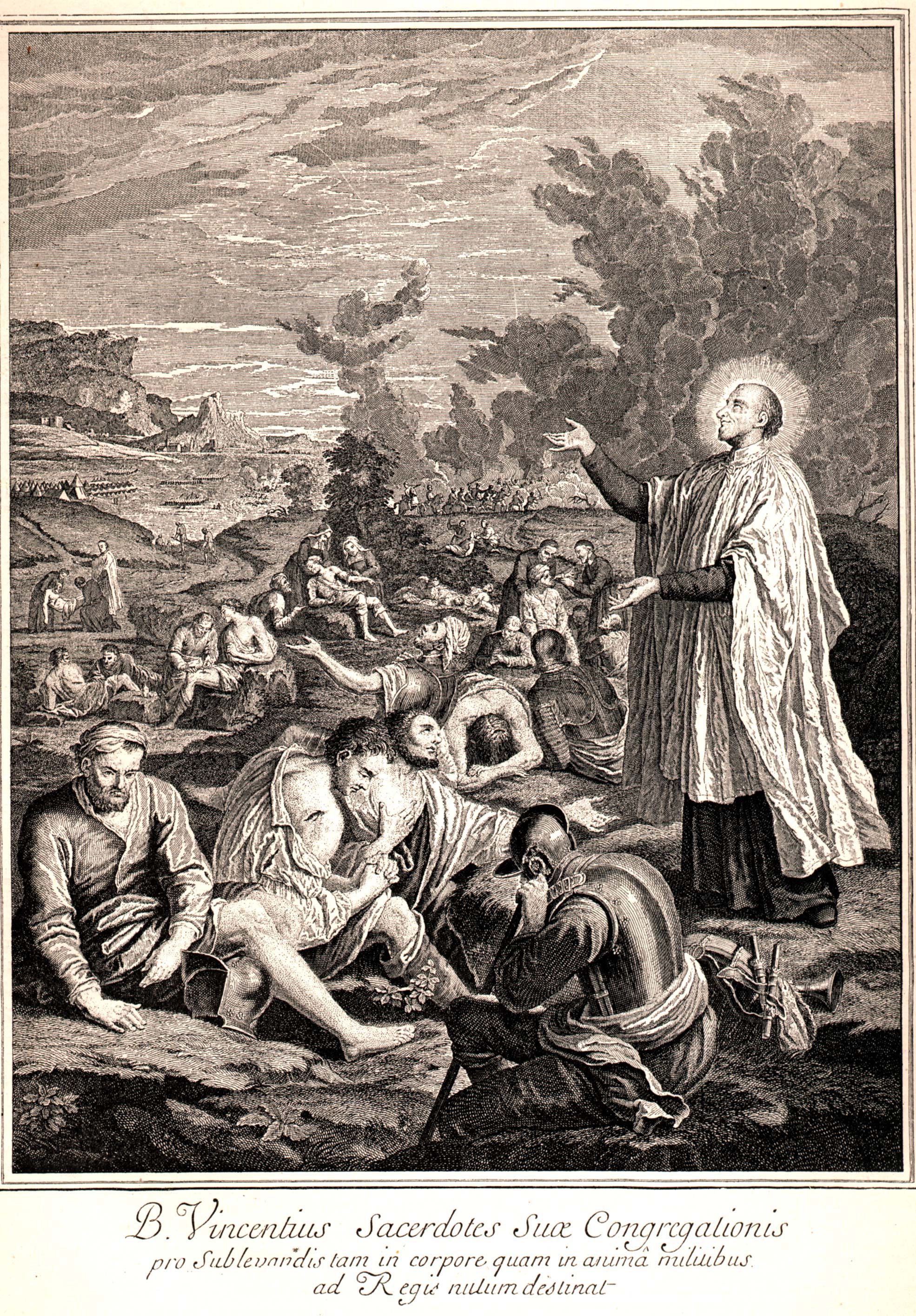 Vincent de Paul, standing, cassock, ample surplice, halo; on battlefield, with wounded soldiers, Daughters of Charity, priests of the Mission; original painting in Ste. Marguerite, Paris; artist, Baptiste Feret