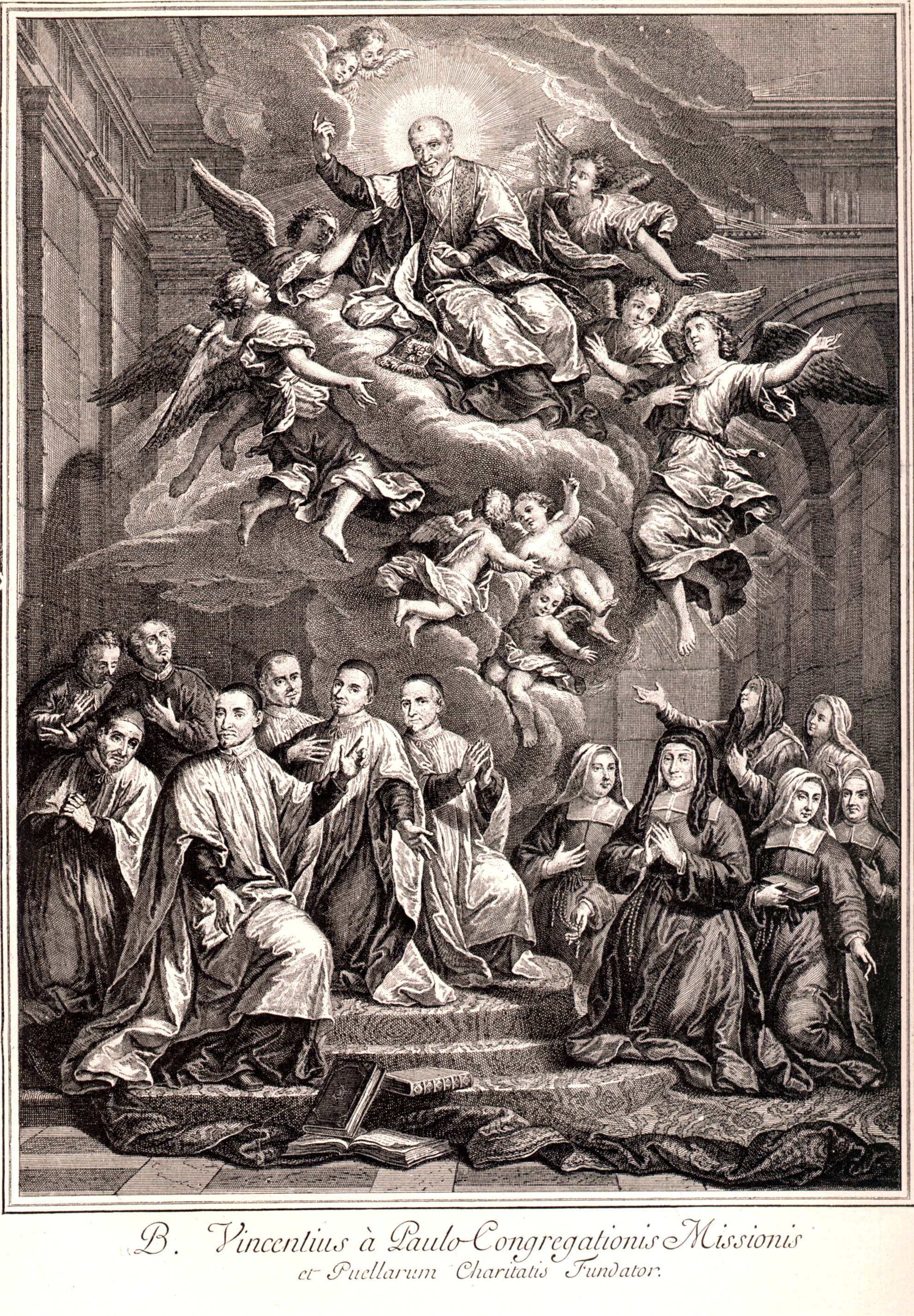Vincent de Paul taken to heaven, Louise de Marillac and priests and Sisters below