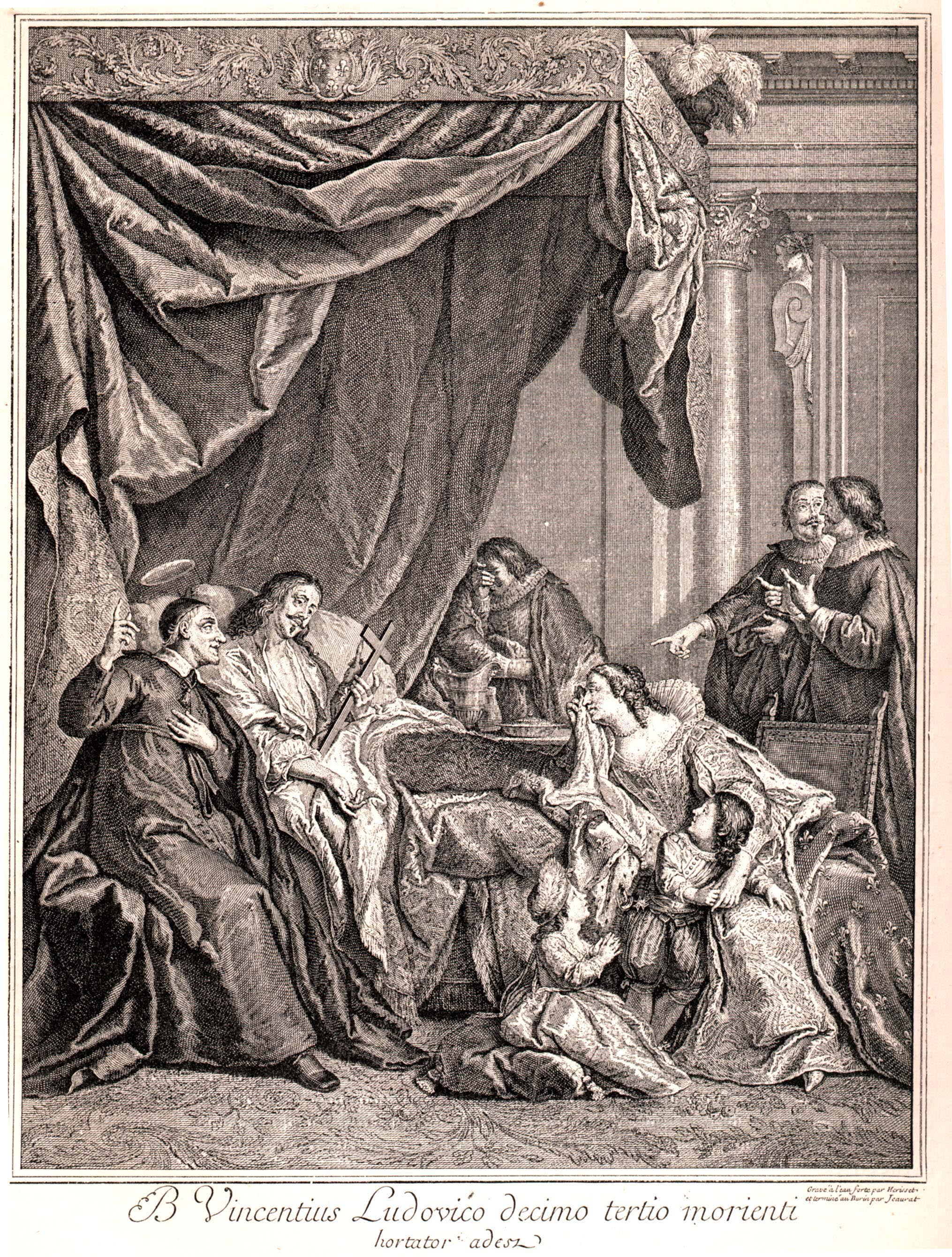 Blessed Vincent de Paul, seated, cassock, cincture, cape, skullcap, halo; king holding crucifix; queen and children, courtiers; original in Copenhagen; artist, De Troy