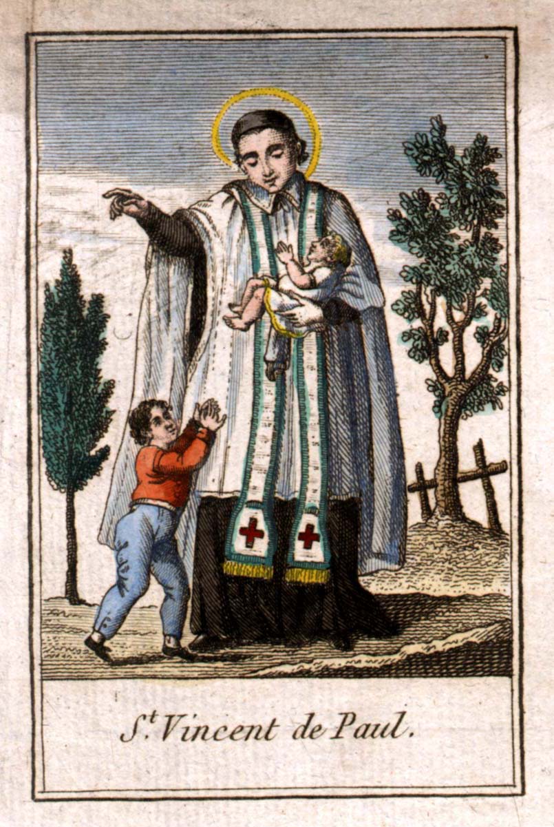 Vincent de Paul, exterior scene, cemetery (?); hand colored; original in Vincentian motherhouse, Paris