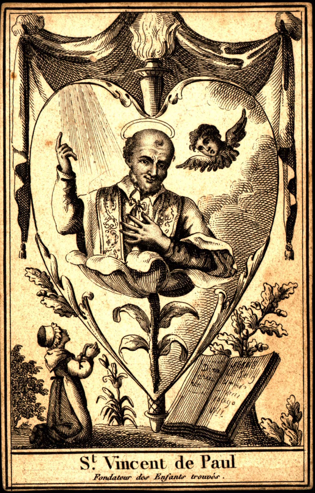 Vincent de Paul, founder of Foundling Hospital; emblems of charity: fire, oak leaves, maize; kneeling child, heavenly light, cherub; original in Vincentian motherhouse, Paris