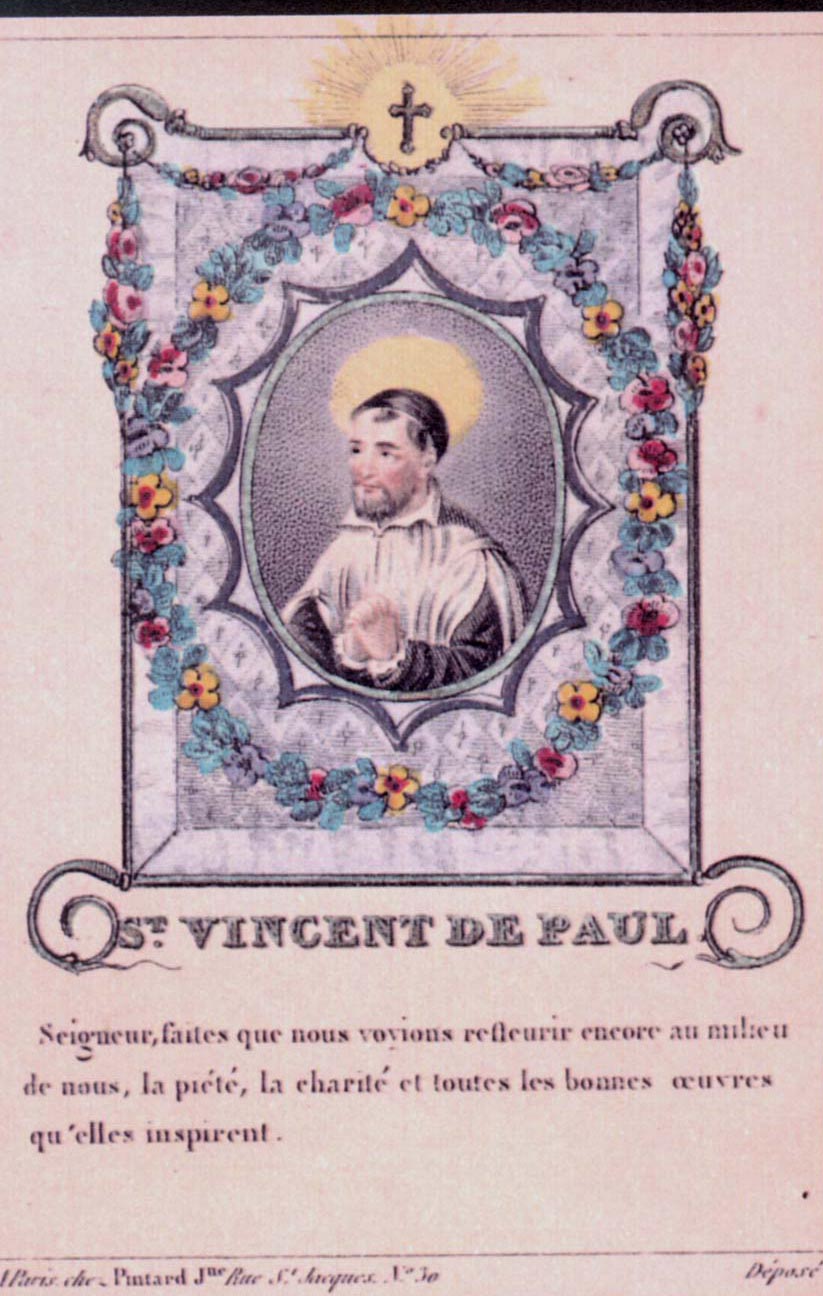 Vincent de Paul in prayer; oval frame with garlands of flowers