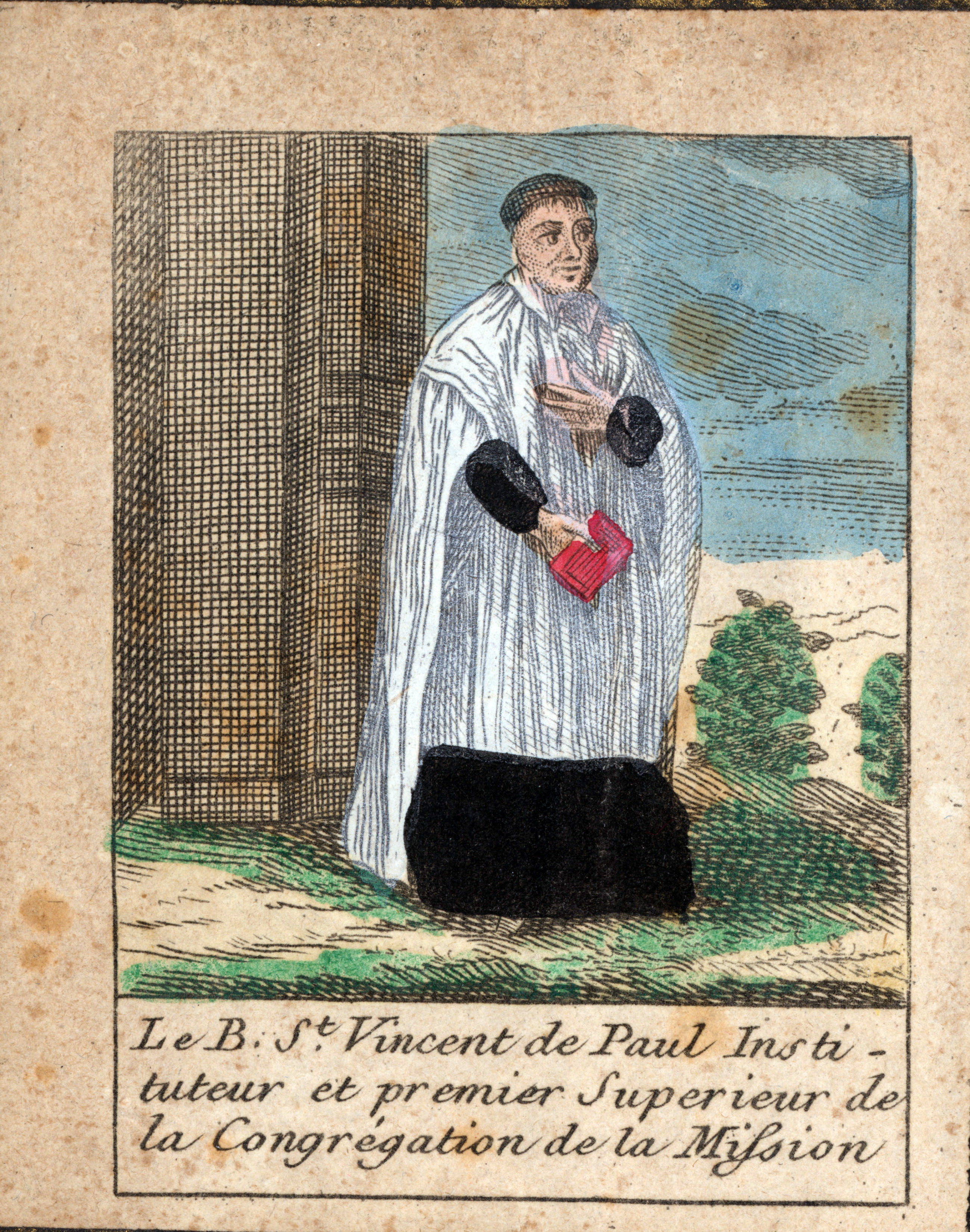 Hand colored, watercolor Text: Blessed Saint VdP, founder and first superior of the Congregation of the Mission