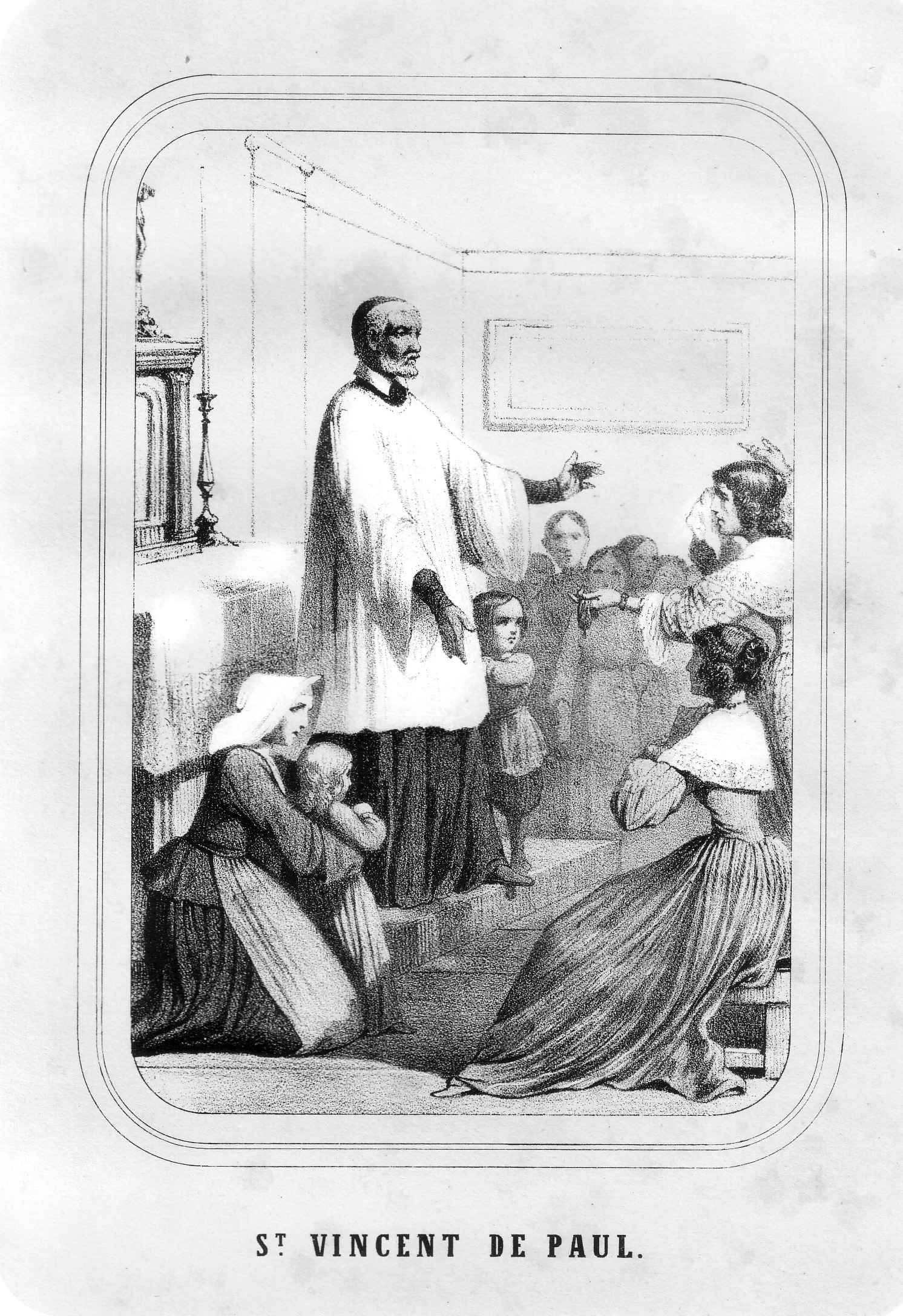 Presenting foundlings to the Ladies of Charity, asking for their support; one lady gives a bag money