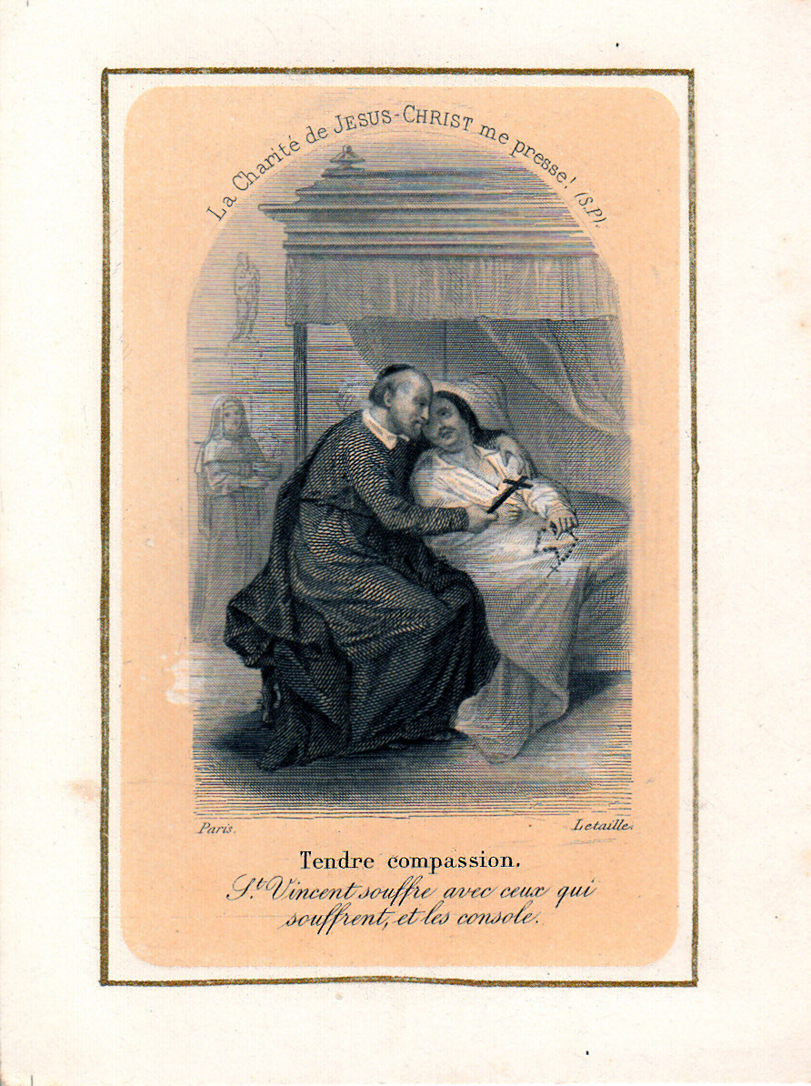 Text: Tender compassion. SV suffers with those who suffer, and consoles them. (Based on standard depiction of SV at deathbed of Louis XIII)
