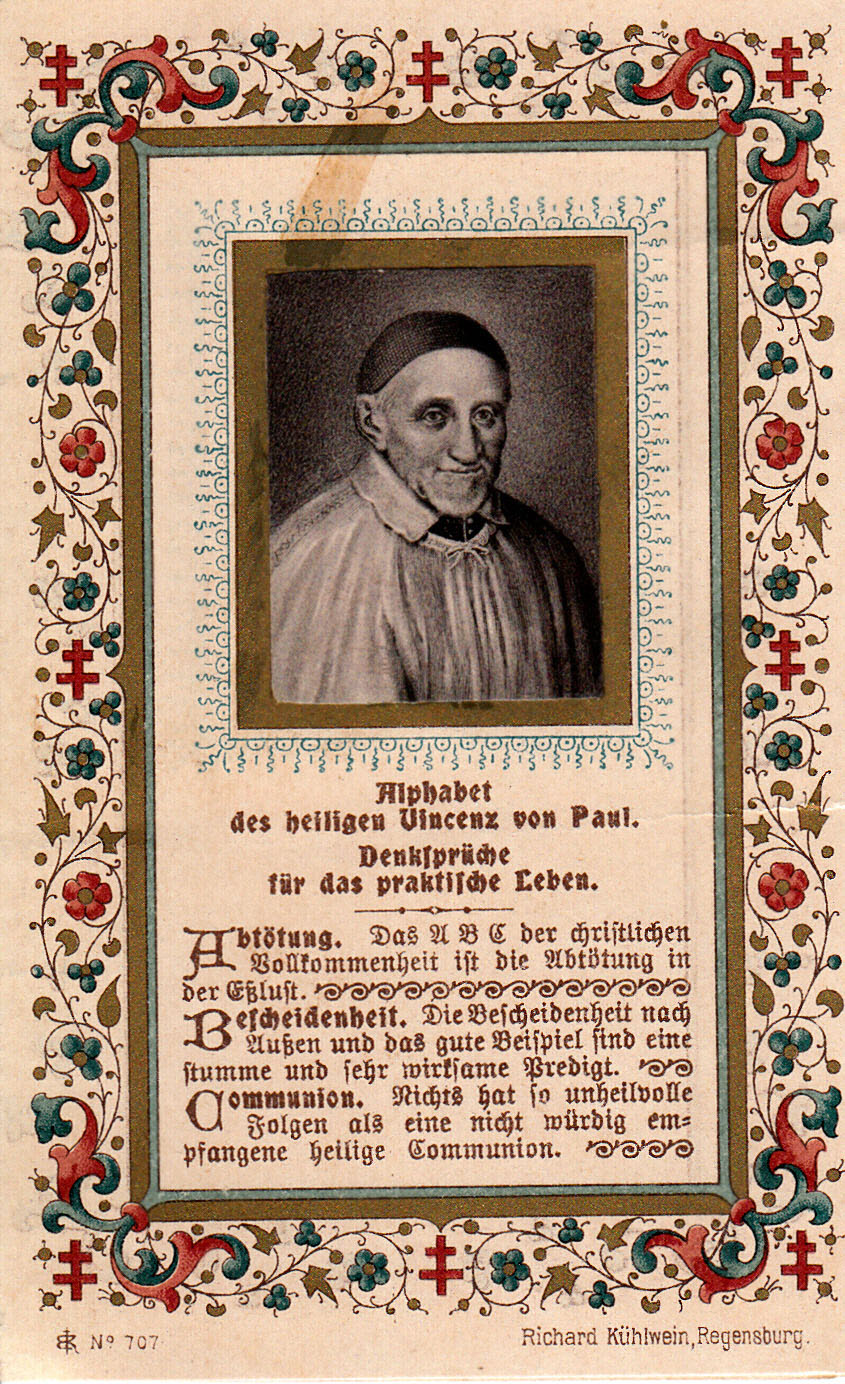 Text: Alphabet of St. VdP. Little sayings for daily life. Mortification ... Moderation ... Communion