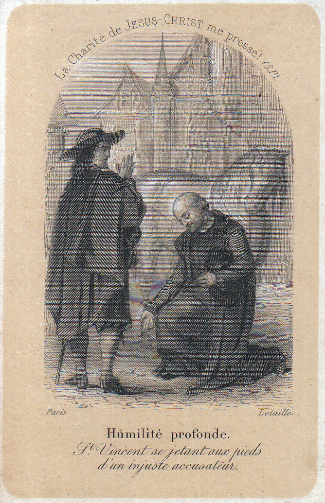 Text: Profound humility. SV kneels at the feet of an unjust accuser