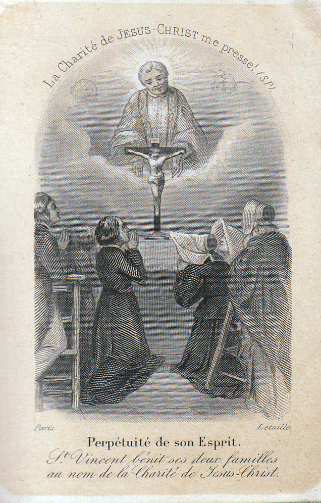 CM and DC kneeling in front, with probable member of the Society of SVdP and a Lady of Charity behind