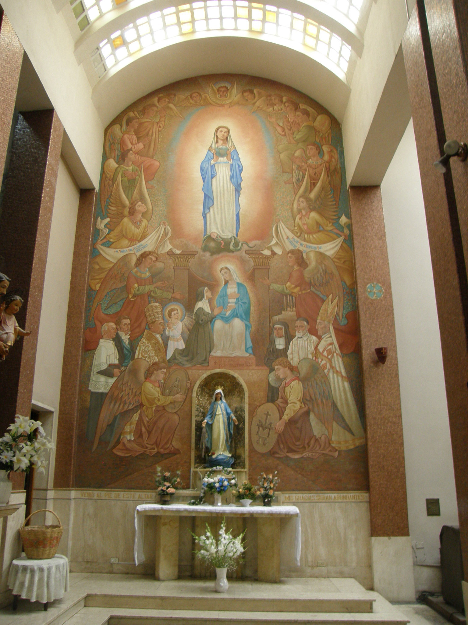 Virgin Mary, with saints and figures, angels, miraculous medal, globe
