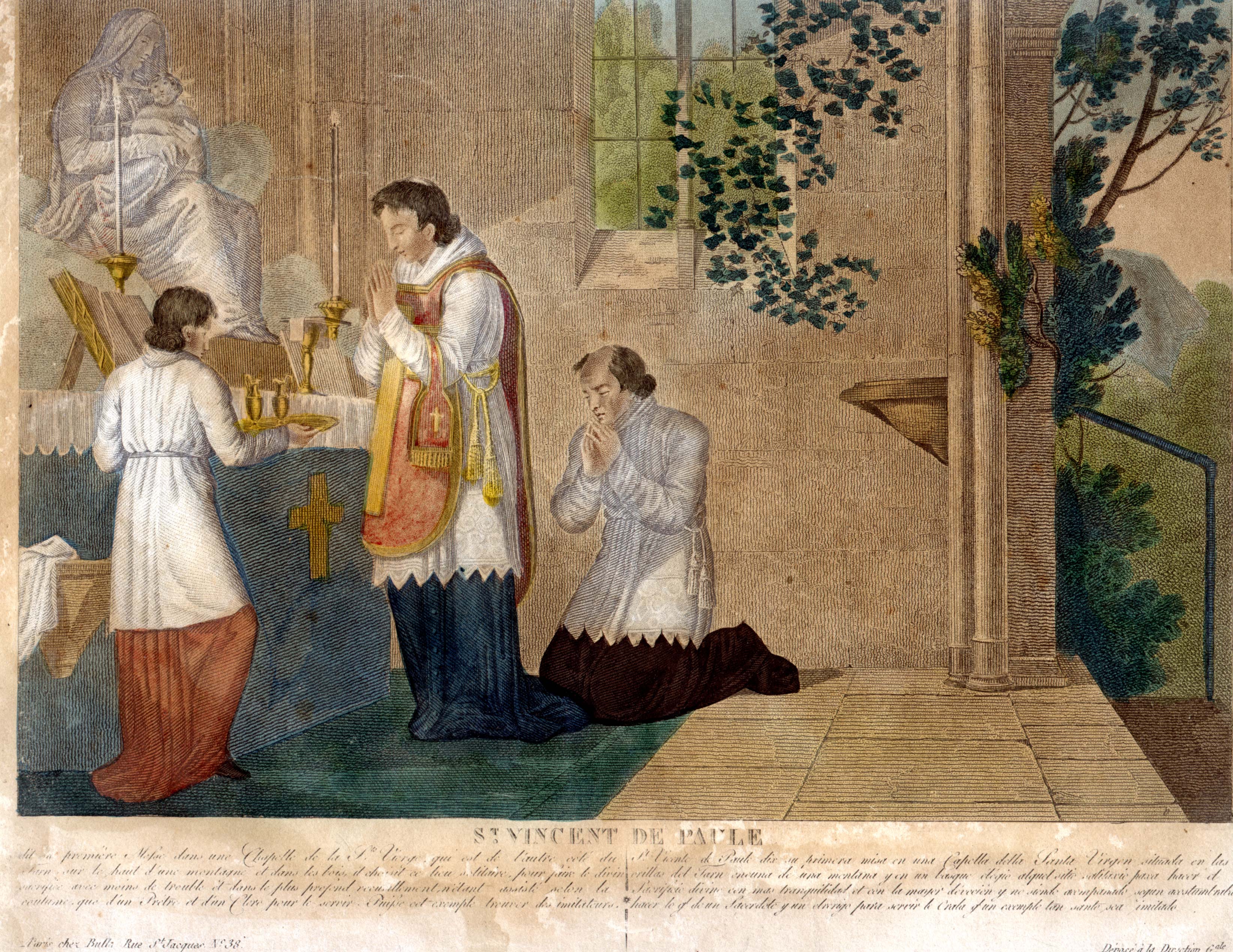 Colored lithograph; Vincent de Paul in priestly vestments (short alb), tonsured; at first mass; altar service, archpriest; rural chapel near Buzet, Notre Dame de Grace; French, Spanish texts; in Vincentian motherhouse, Paris