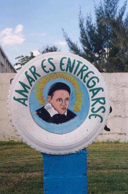 Vincent de Paul portrait, inside painted rubber tire; Spanish text: To love is to surrender onself. Original at parish school, San Francisco de Macoris, Dominican Republic.