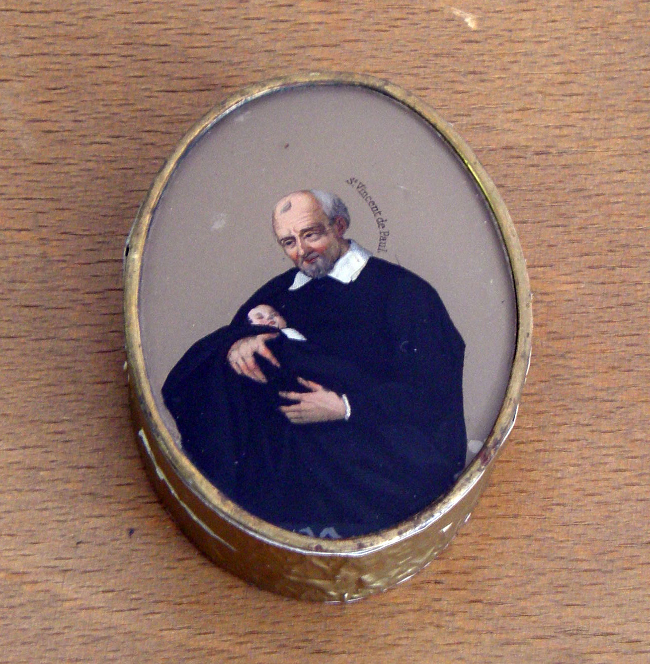 Vincent de Paul on reverse of relic case, sleeping child; original in Vincentian archives, Paris