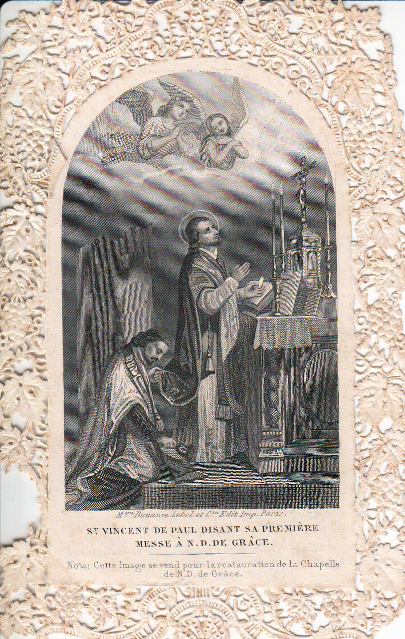 Text: SVdP says his first Mass at Notre-Dame de Grace. Note: this holy card is being sold for the restoration of the chapel of Our Lady of Grace.