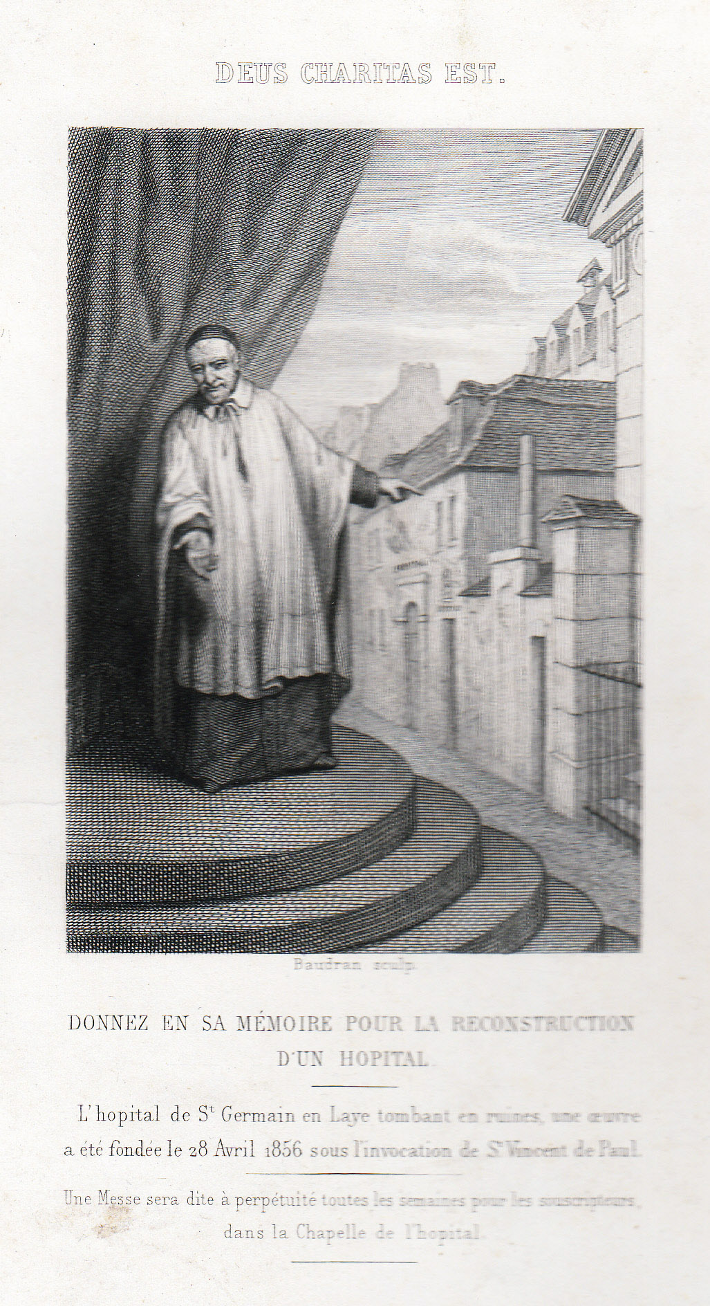 Text: The hospital of St Germain en Laye is falling apart; the work was founded on 28 April 1856 under the invocation of SVdP. -- One Mass will be said forever each week in the hospital chapel for the donors.