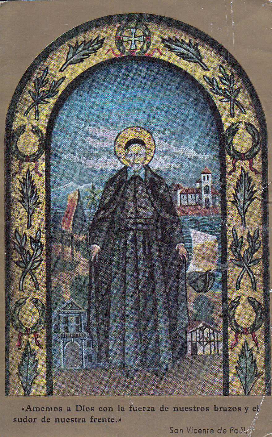 Photograph of original mosaic in Madrid, depicting houses in missionsText: "Let us love God with the strength of our arms and the sweat of our brow"