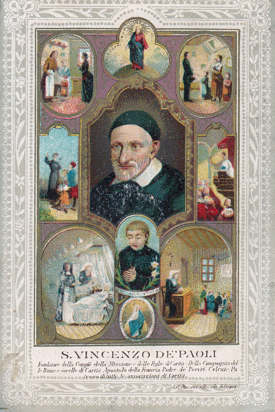 Text: SVdP, founder of the CM, the Daughters of Charity, the Ladies and Sisters of Charity, apostle of France, father of the poor, heavenly patron of all works of charity