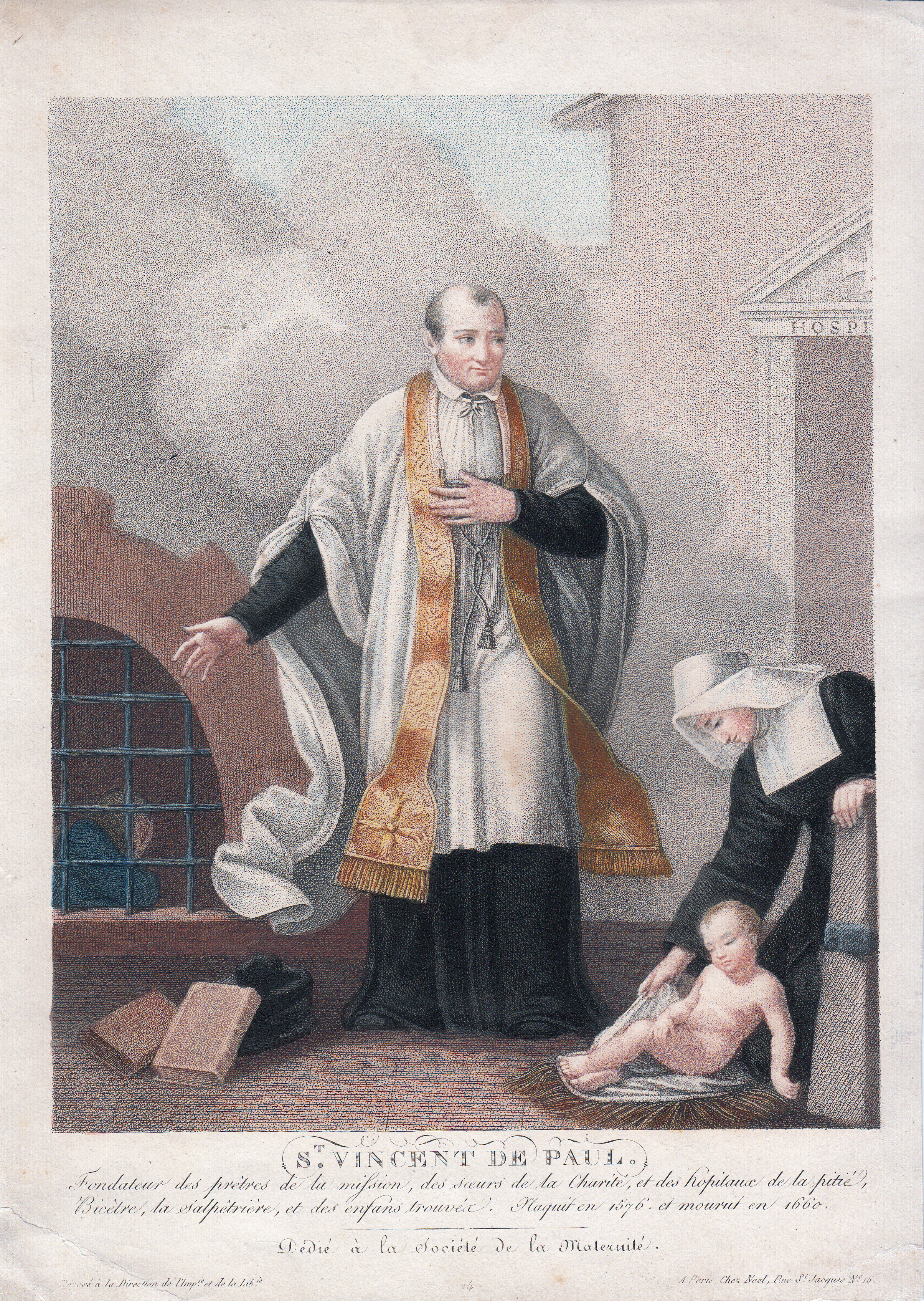 Text: Founder of the Priests of the Mission, the Sisters of Charity, the hospitals of La Pitié, Bicetre, Salpetriere, the Foundlings. Born 1576, died 1660. Dedicated to the charity of the Maternity.