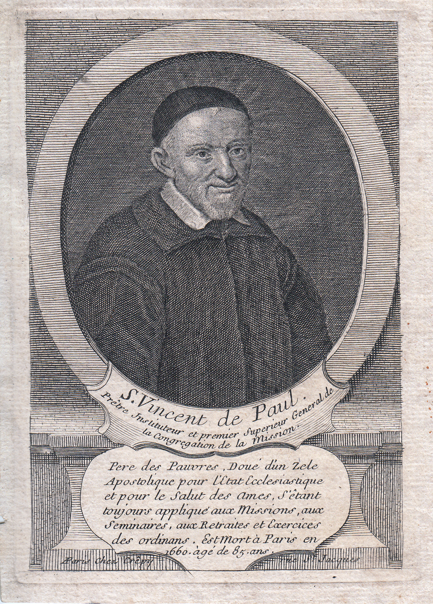 Text: Father of the poor, gifted with apostolic zeal for the clerical state and for the salvation of souls. He was always busy with missions, seminaries, retreats and exercises for ordinands. Died Paris 1660, age 85.