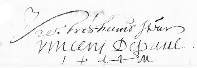 Vtr tres humbl. serv. Your very humble servant, Vincens Depaul, ipdlm (unworthy priest of the Mission) Only signature and initials in St. Vincent's hand. Original, DePaul University