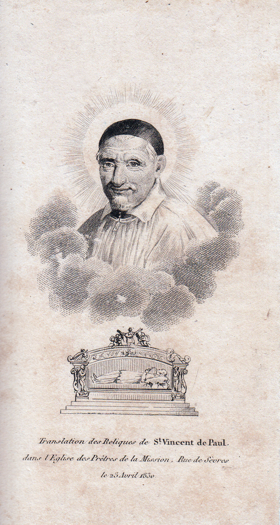 Text: Translation of the relics of SVdP into the church of the priests of the Mission, rue de Sèvres, 25 April 1830 Placement of the body is reversed from the original