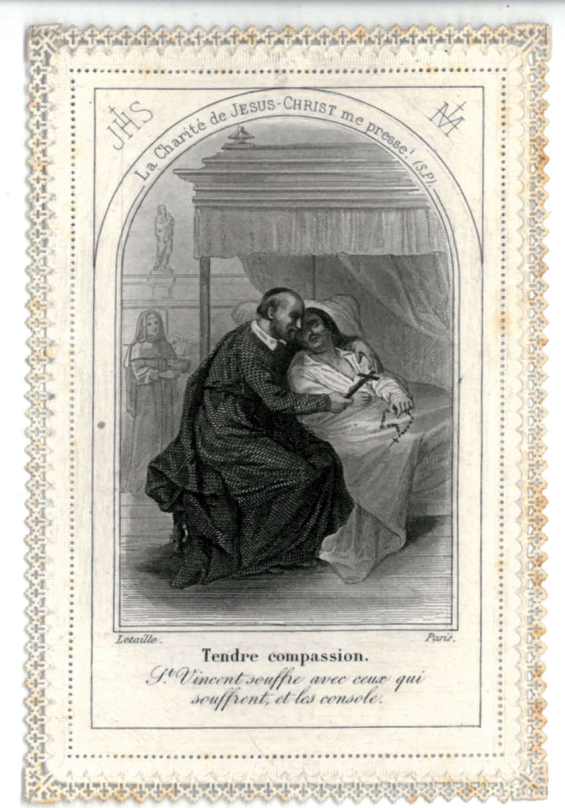 Text: SV suffers with those who suffer and he consoles themShown at the deathbed of Louis XIII