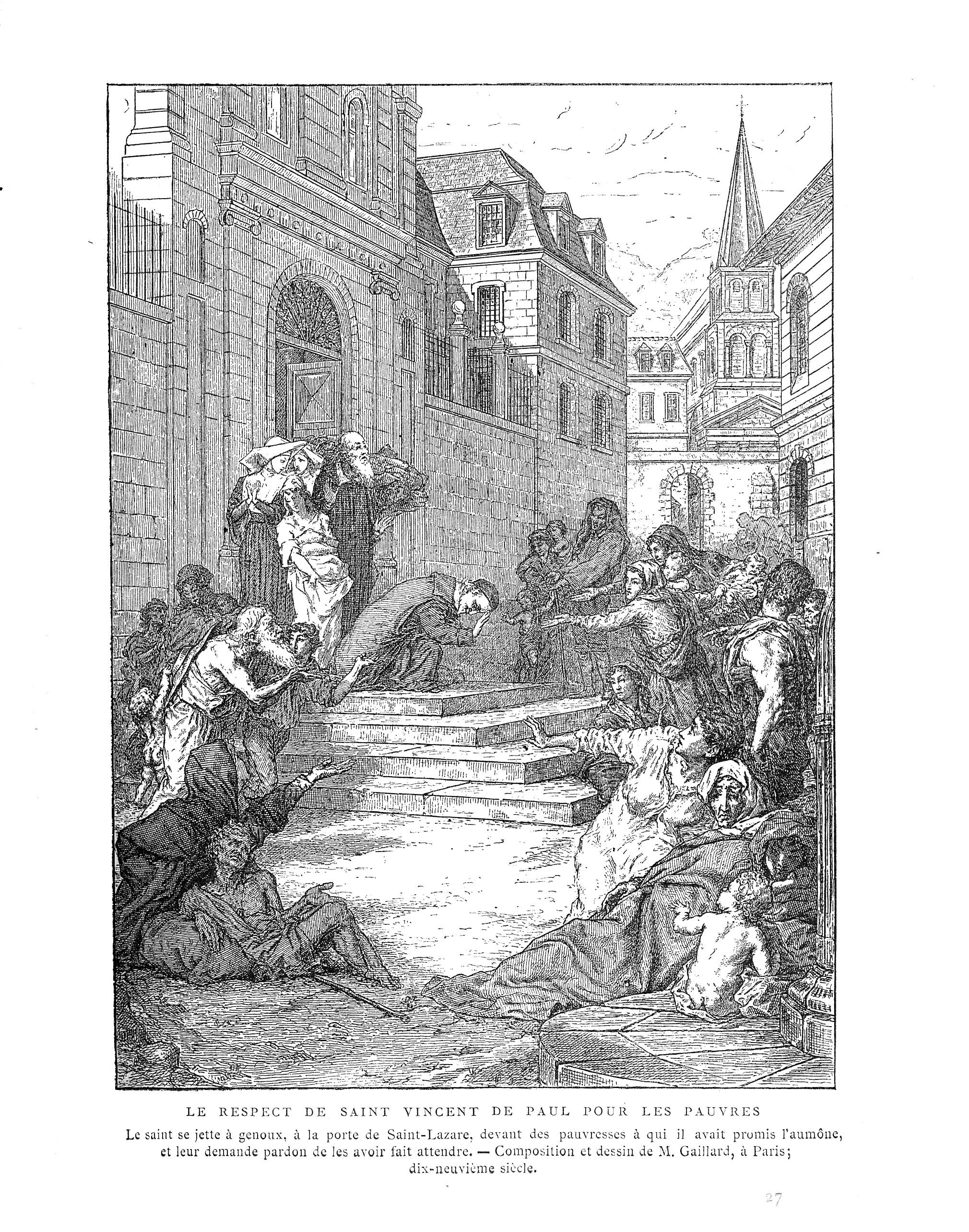 Engraving in Arthur Loth, (Mission Sociale), Vincent de Paul at door of St. Lazare, kneeling before the poor; work of M. Gaillard