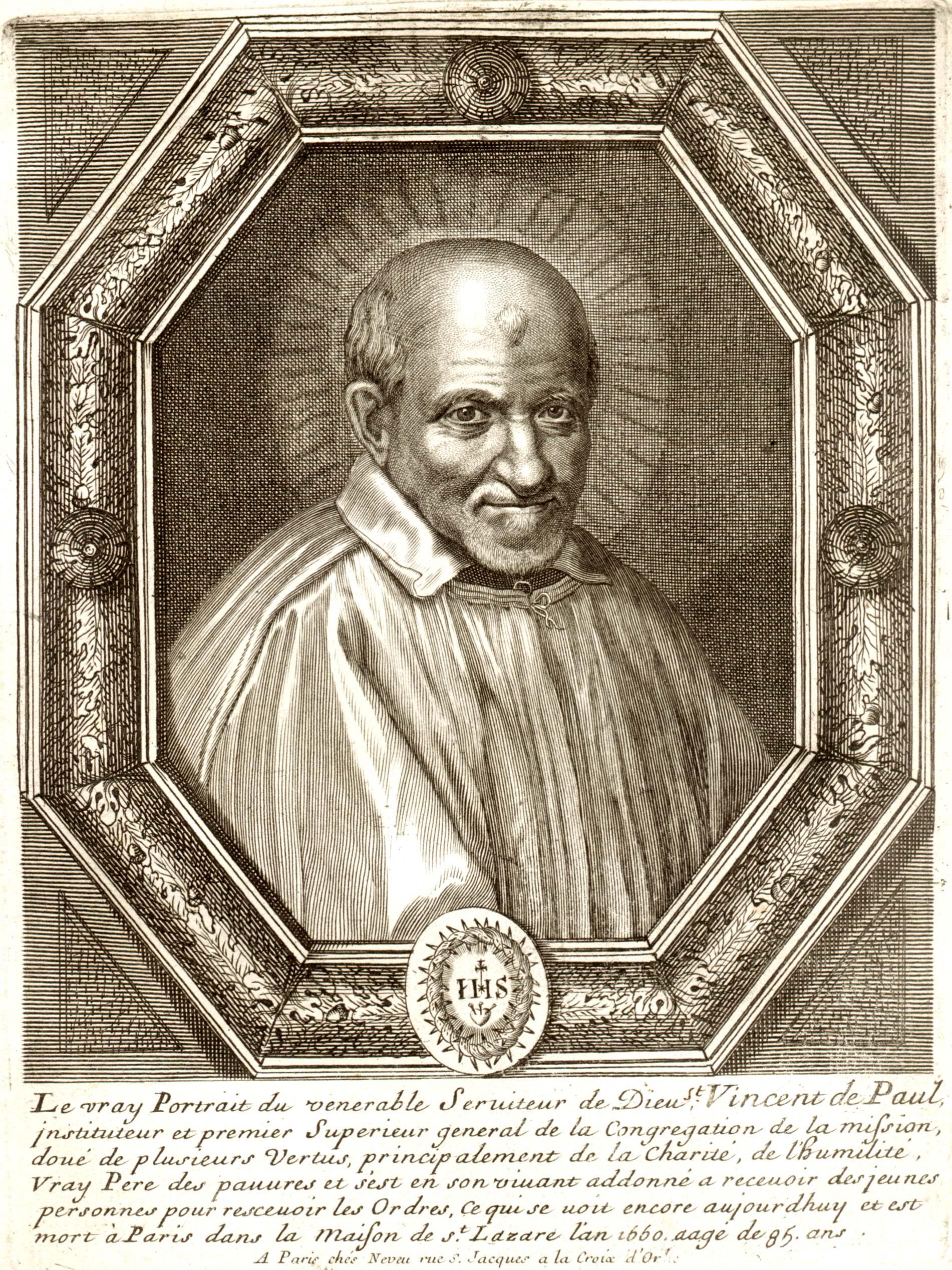 Vincent de Paul, after Simon François de Tours (in Moutiers-St-Jean), French text, virtures (charity, humility), father of poor, caring for ordinands; "Venerable Servant of God," i.e., before beatification, 1727; "St" added by hand; sold by Neveu, Paris