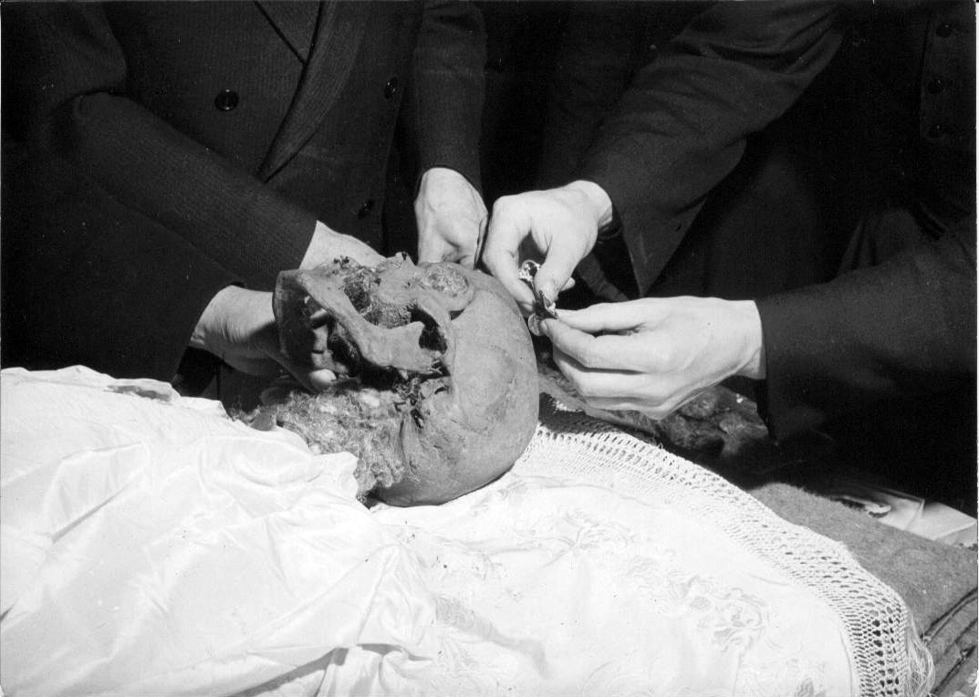 Touching some holy objects to the skull. All the bones of his left hand were removed to prepare relics. A wax hand replaced it.