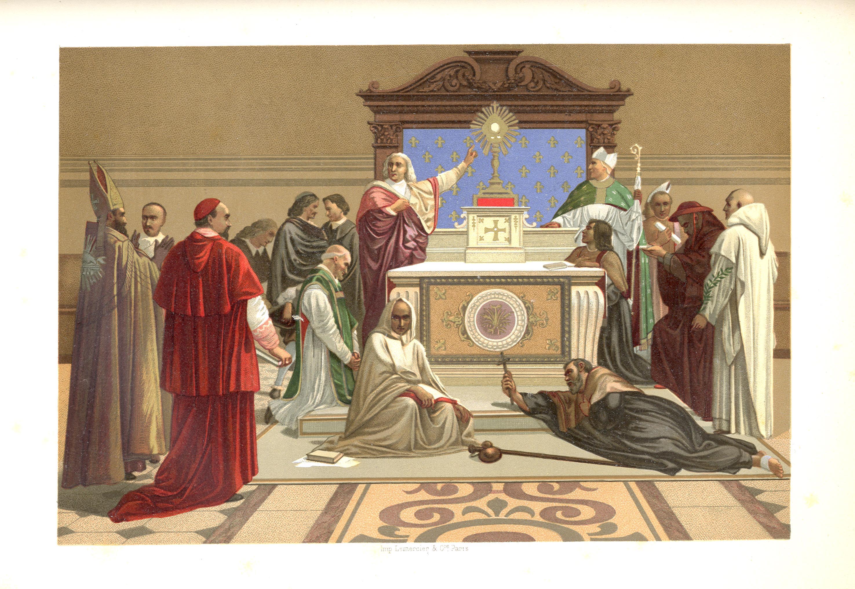 Chromolithograph; mural in chapel of Sorbonne; Vincent de Paul, kneeling, priestly vestments, in prayer before Eucharist; other theologians discuss and debate; work of Timbal
