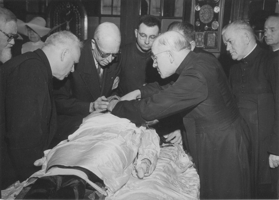 L-R: Frs. Verhas, Houfflain, Dr. Didier; Bro. François Leon Gourges, Mons. Dubois, Waclaw Knapik; examining skull; rest of bones wrapped in cotton and silk; left hand missing (used for relics)