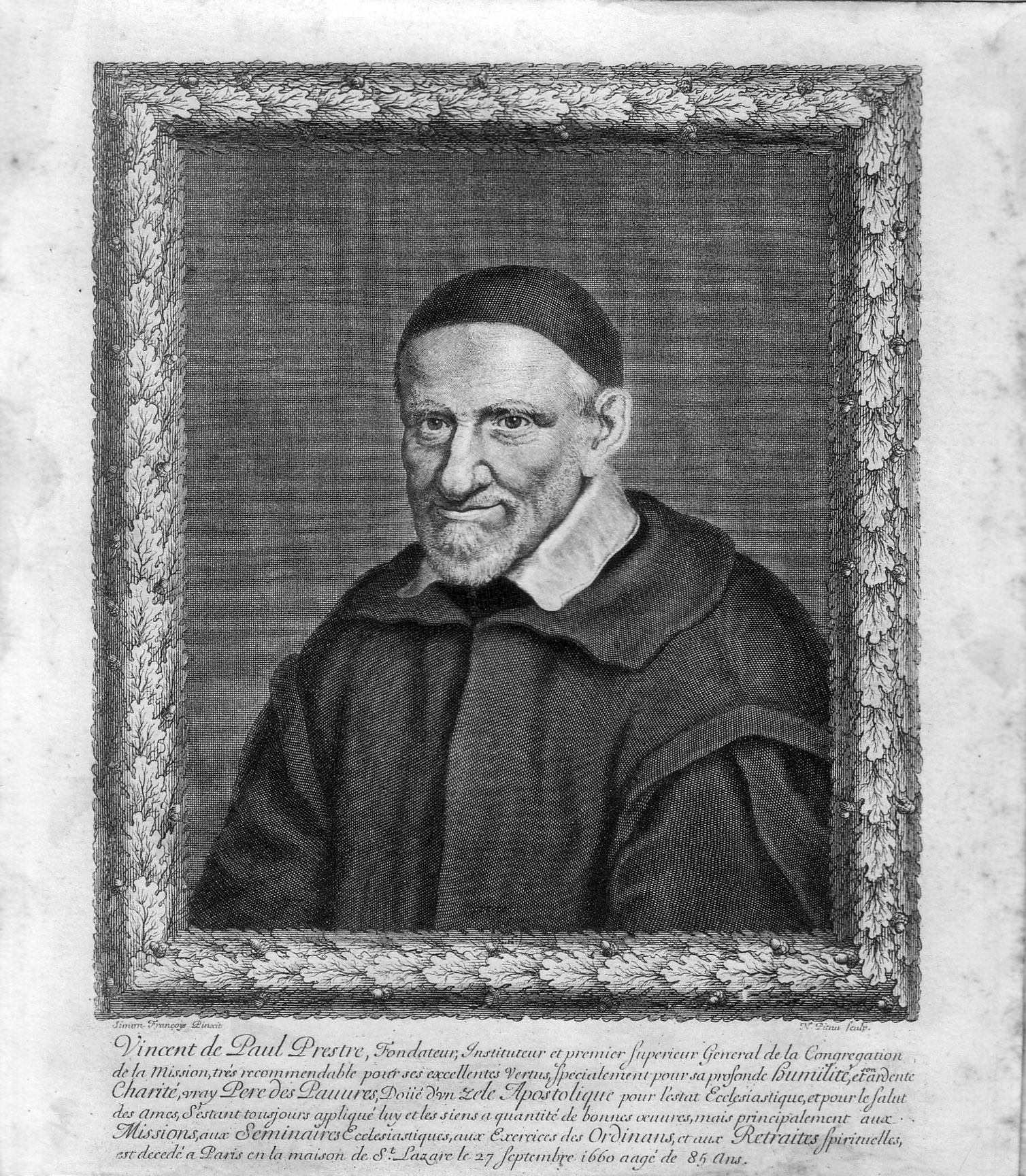 Copy at DePaul University. Text: Vincent de Paul, Founder, Institutor and first superior general of the Congregation of the Mission, much to be commended for his excellent virtues, especially for his deep humility and his burning charity ...