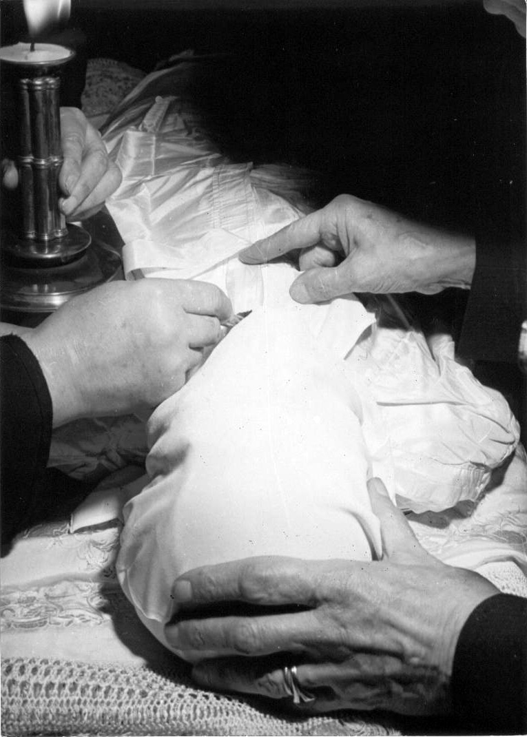 Finishing the arrangement of the skull, covered with white silk; Vincent's candlestick at left