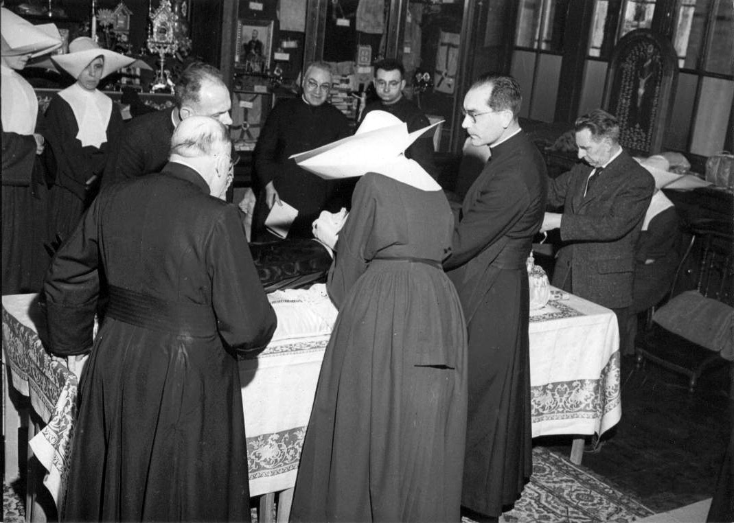Mother Lepicard arranging some of the coverings of the body; L-R: Mons. Dubois, Paul Gunth, Mother Lepicard, Michel Lloret; M. Clapel