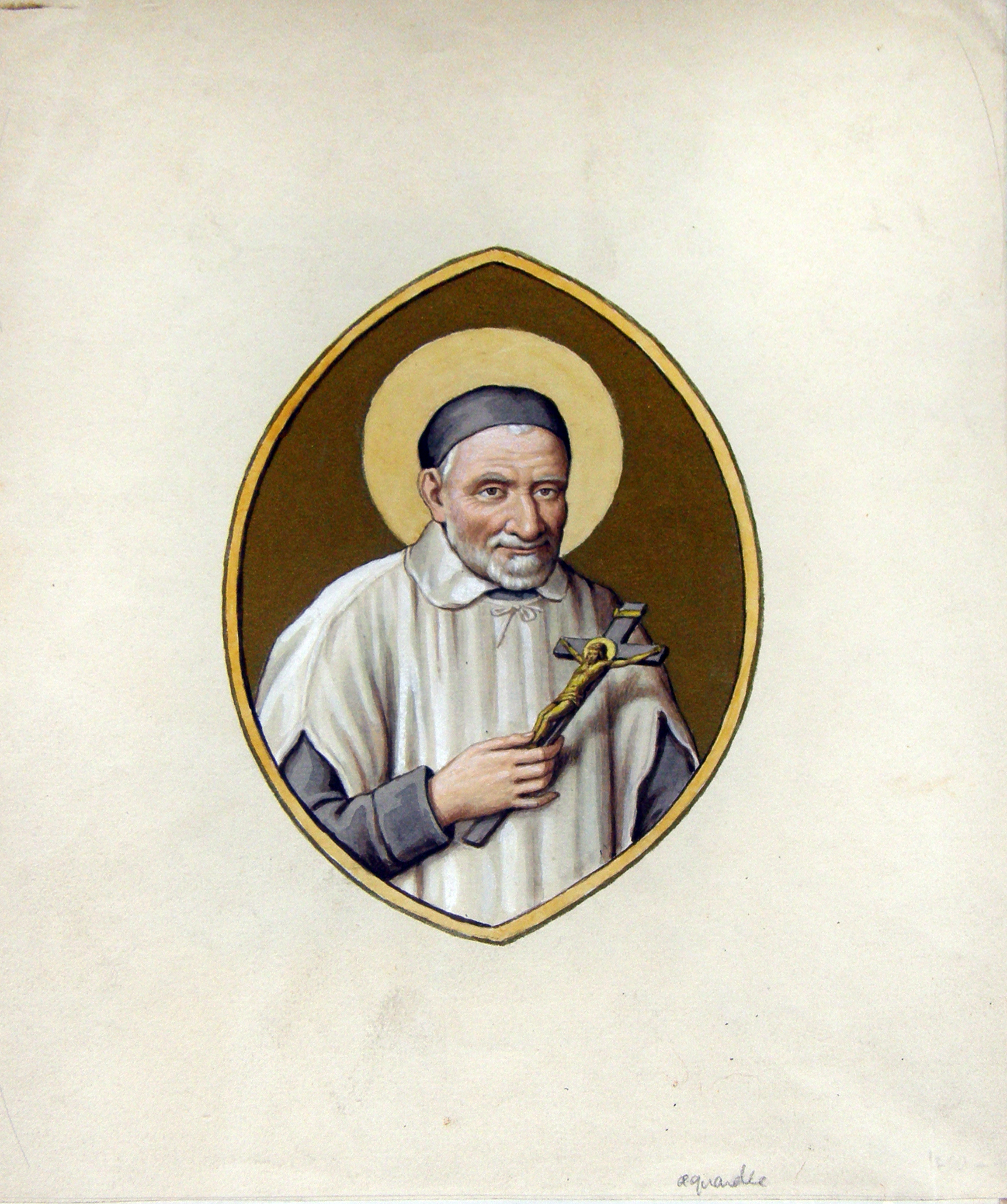 Vincent de Paul, standing, cassock, surplice, skullcap, halo; holding crucifix; original in CM archives, Paris
