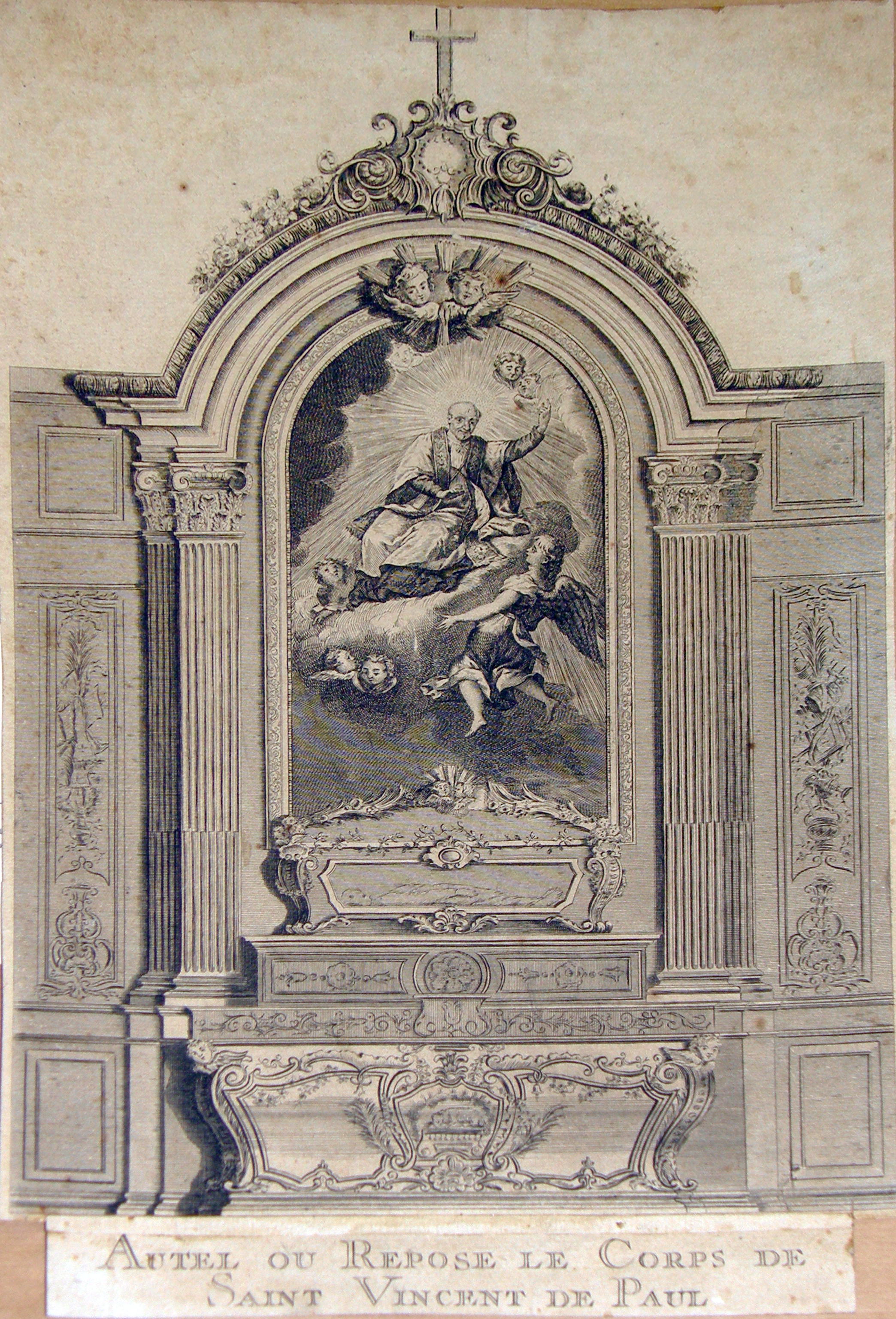 Tomb, altar and painting at old St. Lazare; reliquary destroyed in revolution; location of altar painting unknown; original engraving in CM archives, Paris