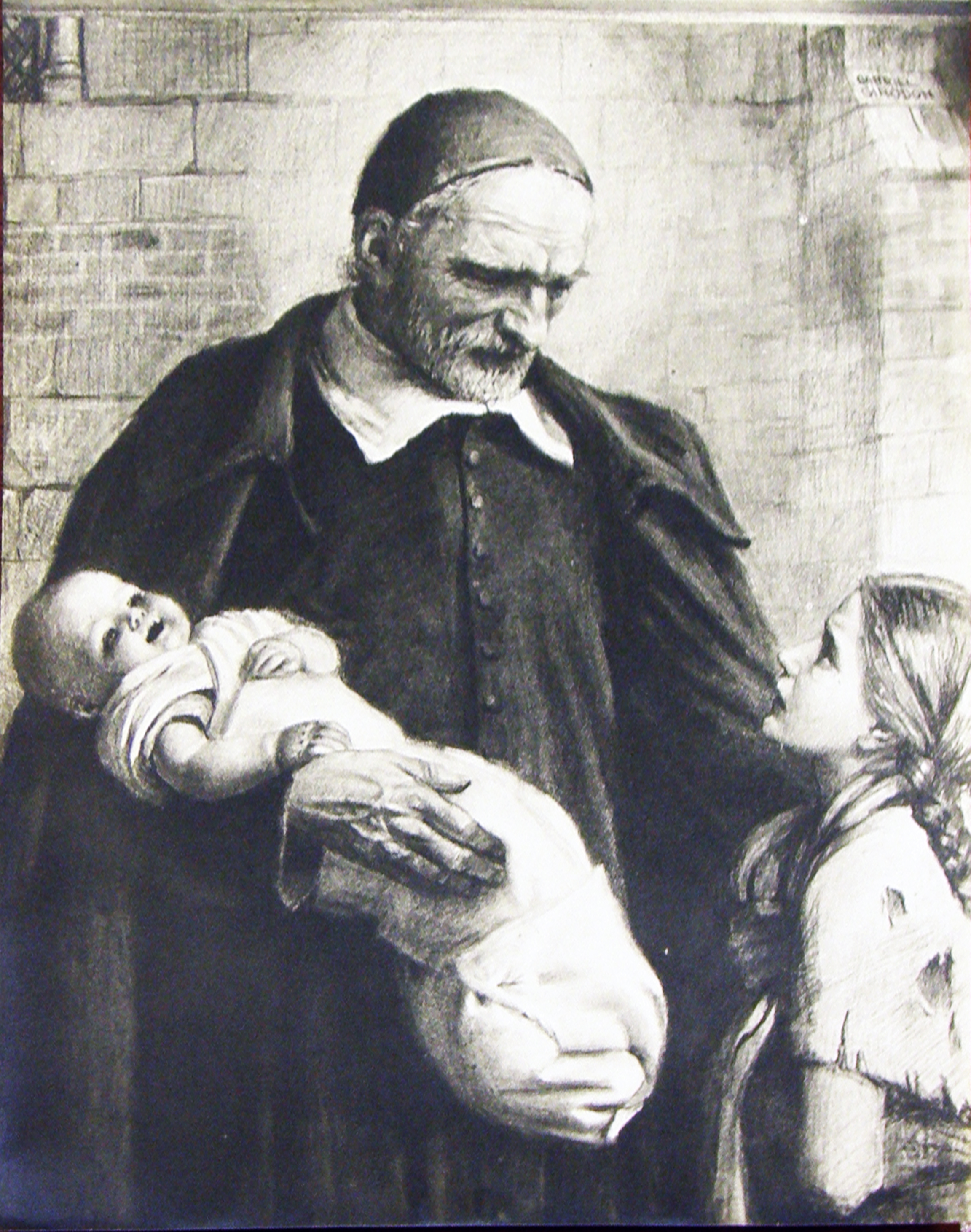 Vincent de Paul, weathered face; with two children; original in CM archives, Paris