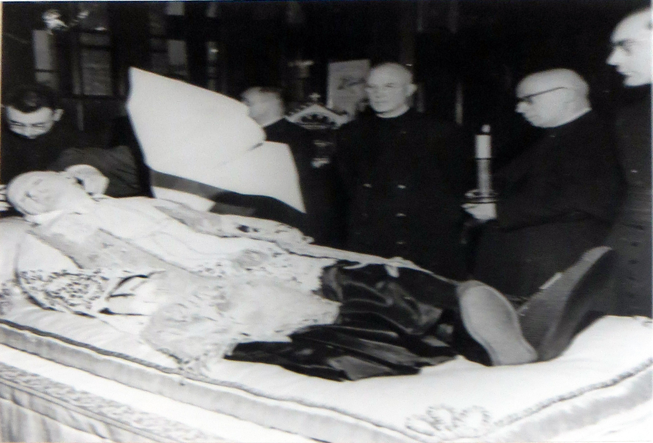 Wax mask placed on skull; Mother Lepicard works to set the remains in the desired position