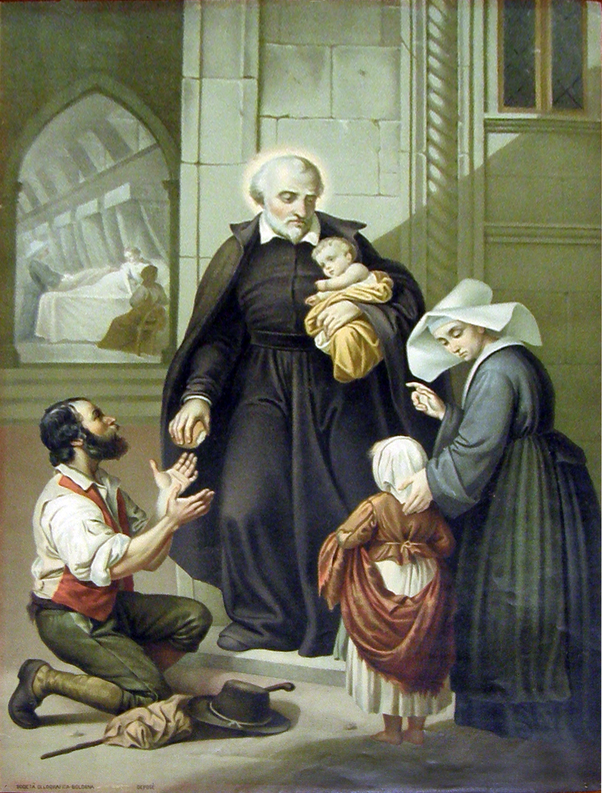 Vincent de Paul with children, poor man, Sister; hospital beds in background; original in CM archives, Paris