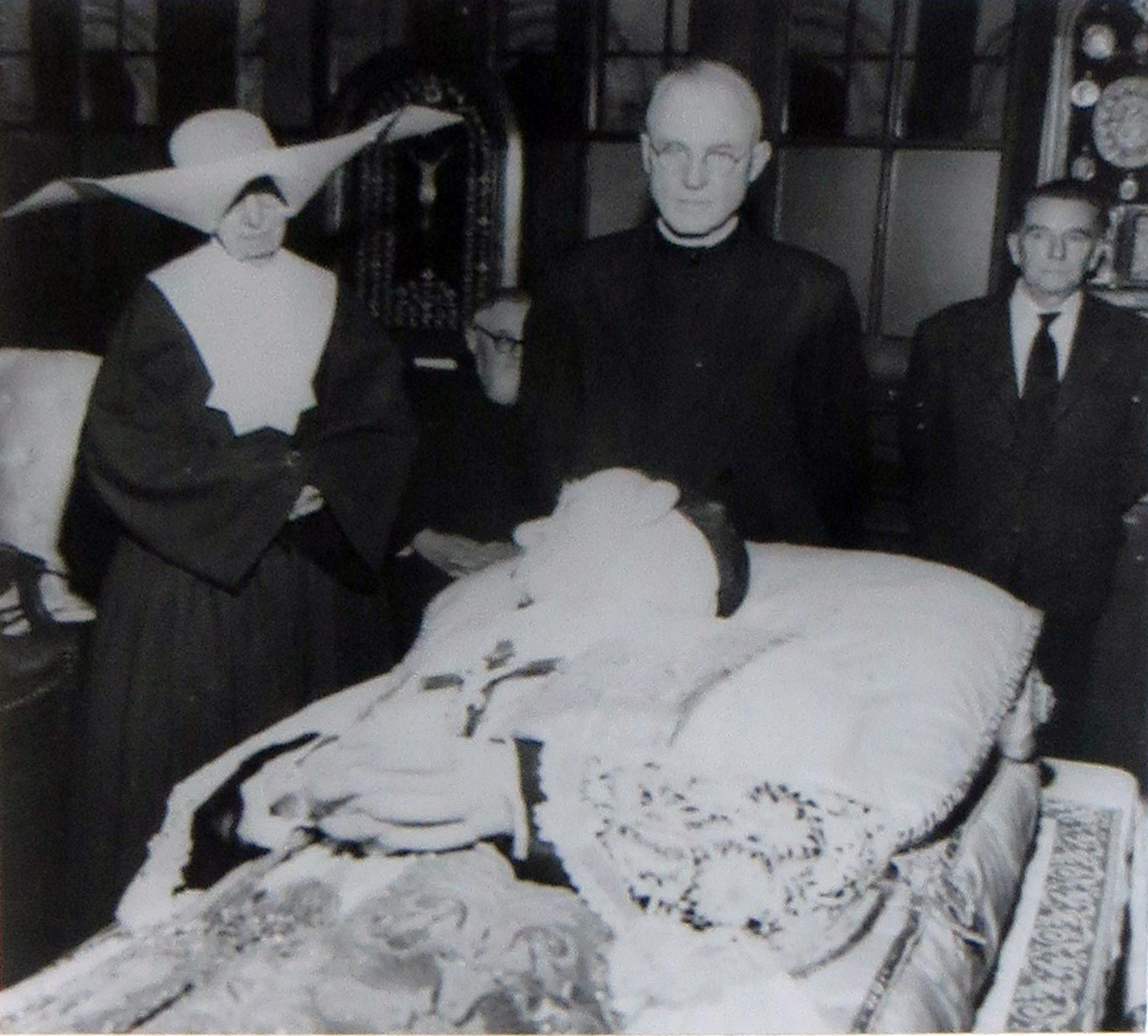 Mother Lepicard and Fr. Slattery standing behind the newly-arranged clothing and remains