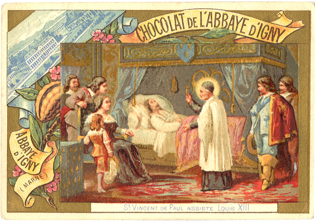 Vincent de Paul assists at the deathbed of Louis XIII; drawing of abbey buildings at Igny (Marne); flowers and chocolate pod.