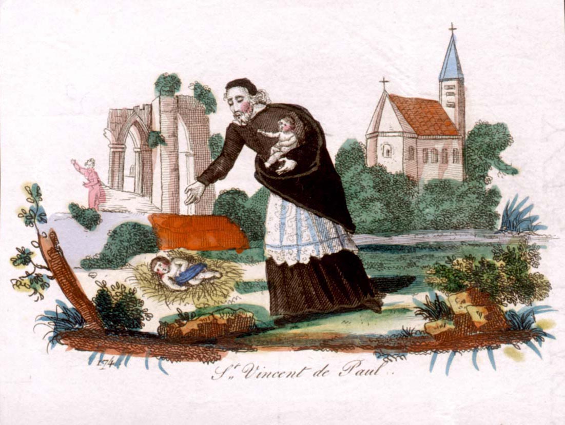 Based on Monsiau; Vincent de Paul gathering infants; mother in background left; exterior scene; see also a version on wallpaper in this collection