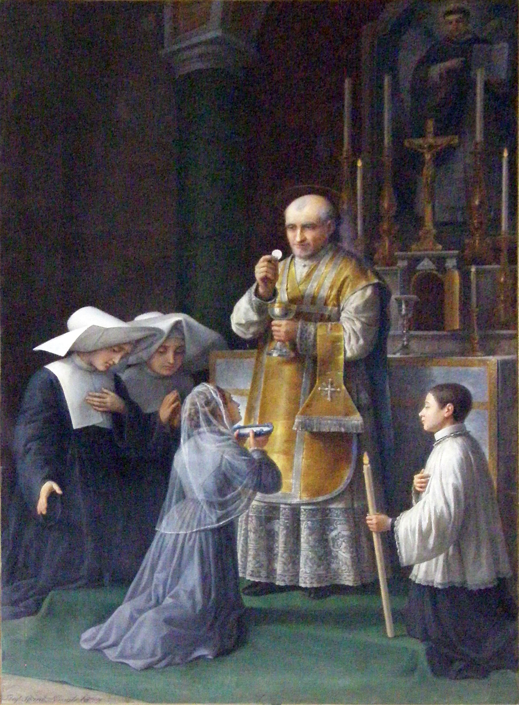 Vincent de Paul, standing at altar, priestly vestments; giving communion to girl; two Sisters; altar server with candle; original in cathedral of Izmir; artist: Raffaele Spanò, Naples, 1877