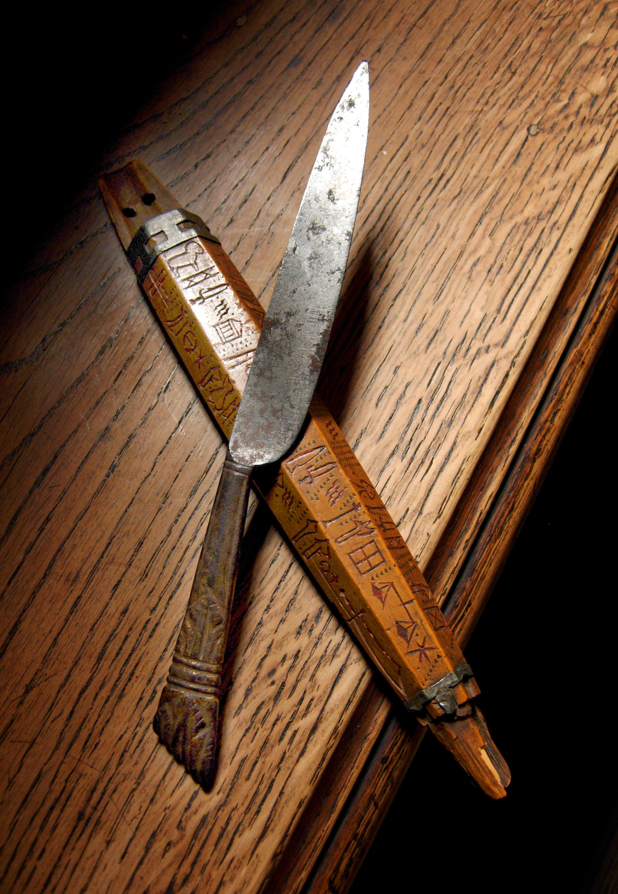 Steel knife and wooden case, covered with signs