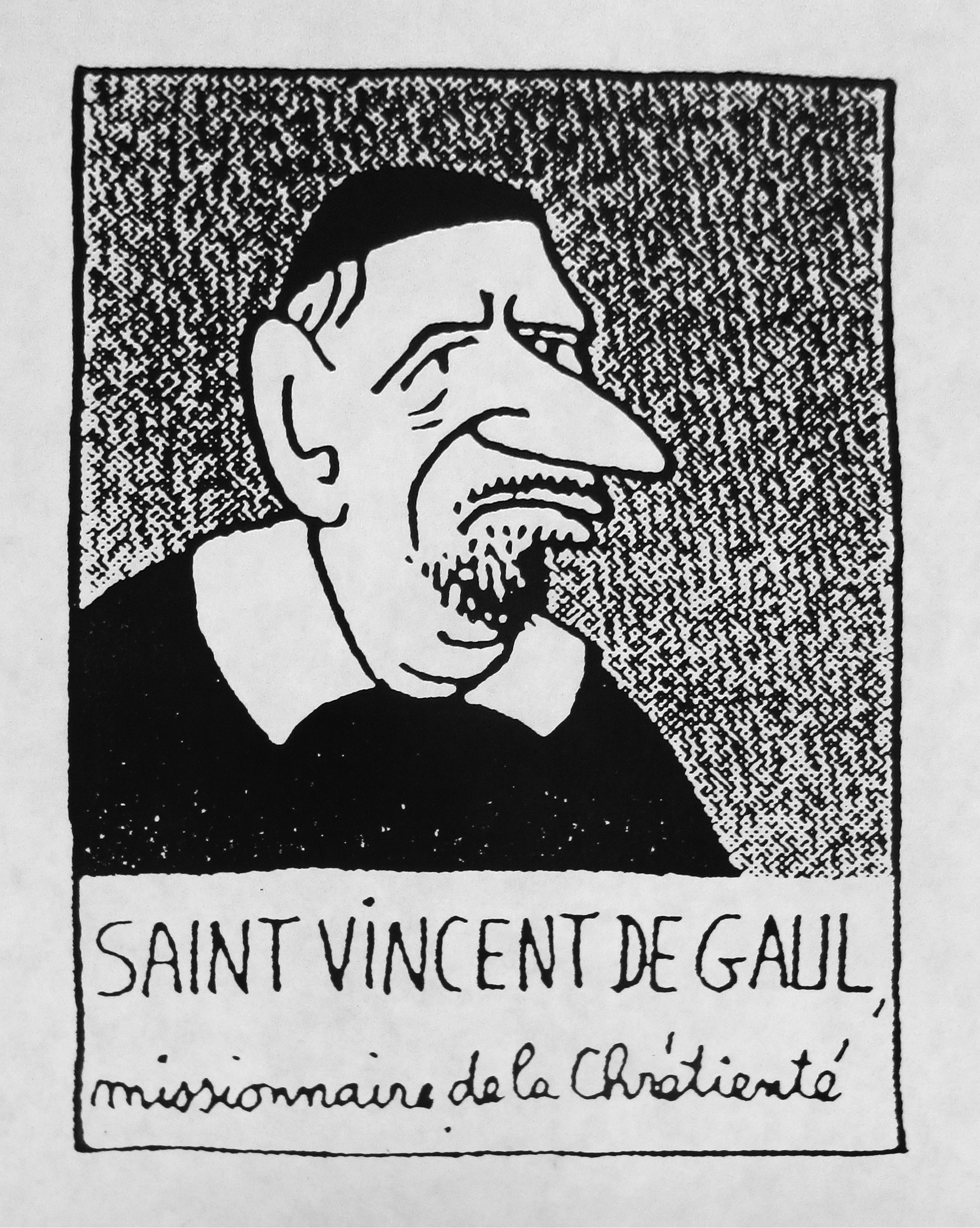 Cartoon of Charles de Gaule, dressed as SVdP, missionary of Christianity