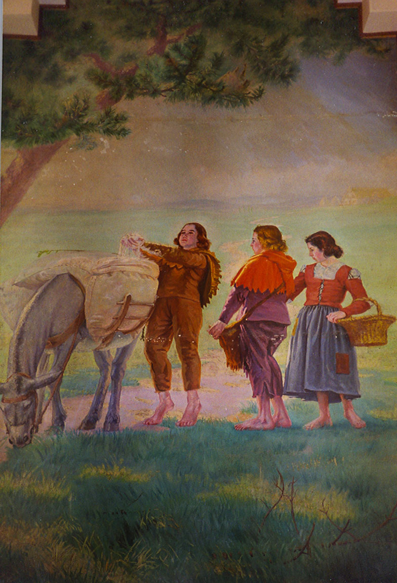 Mural painting; young Vincent de Paul shares grain with two poor people, mill in background; Original in Vincentian parish, Pamplona