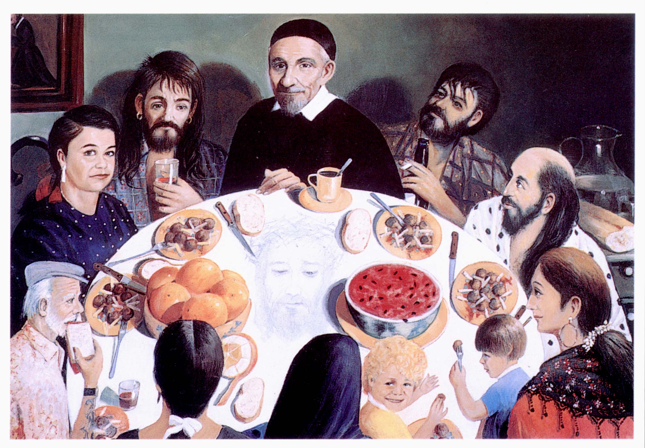 Vincent de Paul and table fellowship with poor, Lord's face in center