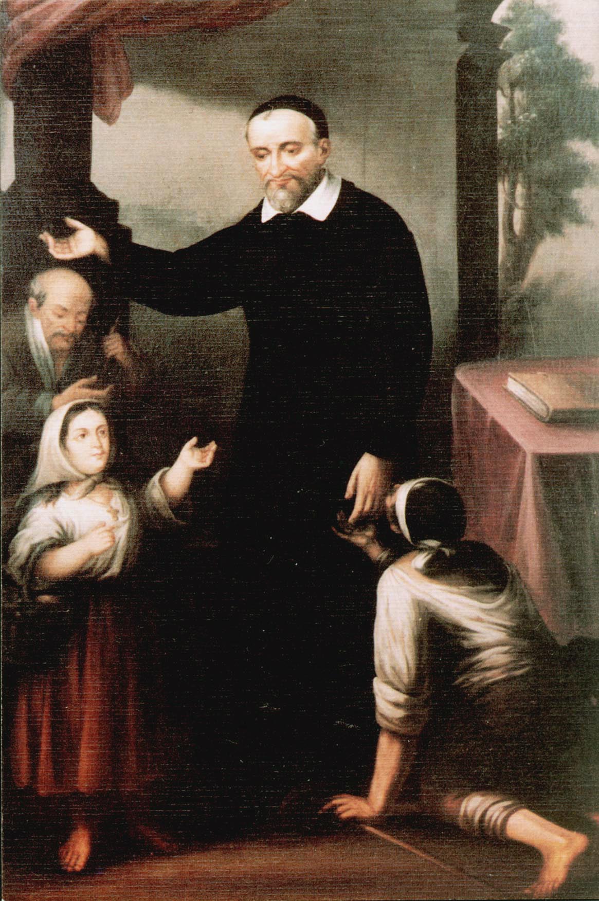 Oil painting; Vincent de Paul, standing, cassock, skullcap, with three poor person; closed book on table; original in hospital de Maria, San Fernando, Cadiz; unknown artist