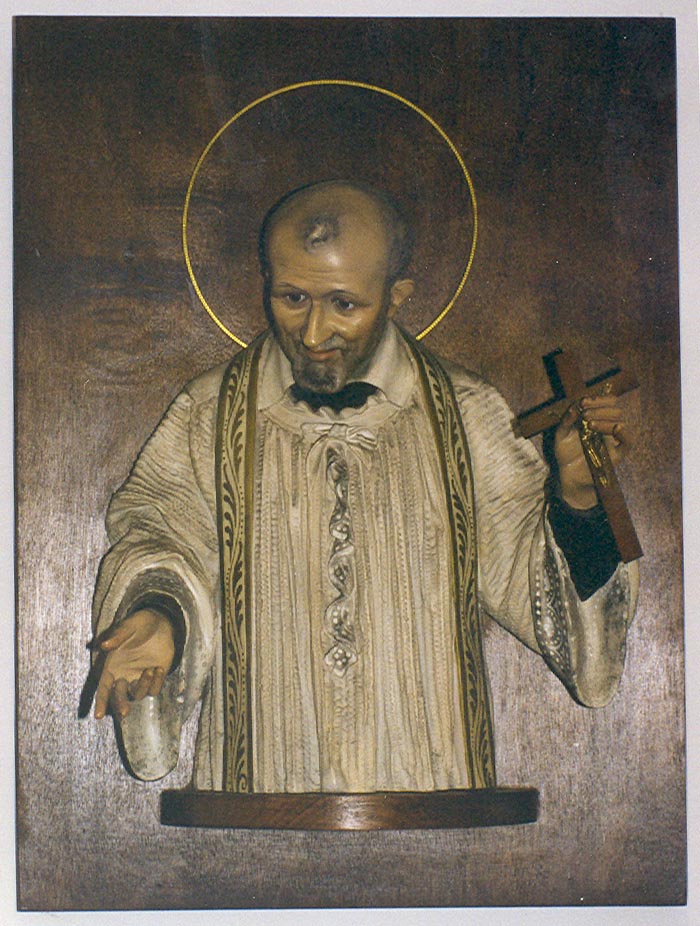 Carved wood wall plaque, Vincent de Paul preaching, with crucifix (standard Spanish style); original in Vincentian provincial house, Barcelona