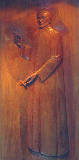 Wooden wall plaque above altar, Vincent de Paul with crucifix, gesturing; original in Vincentian parish, Zaragoza
